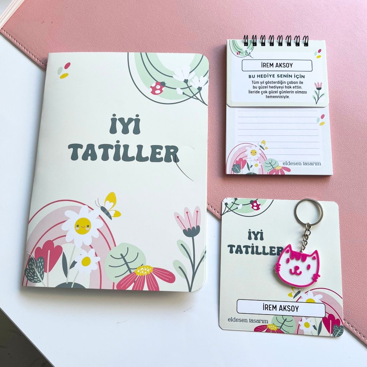 İsme özel defter, anahtarlık ve karne kılıflı içermektedir.
