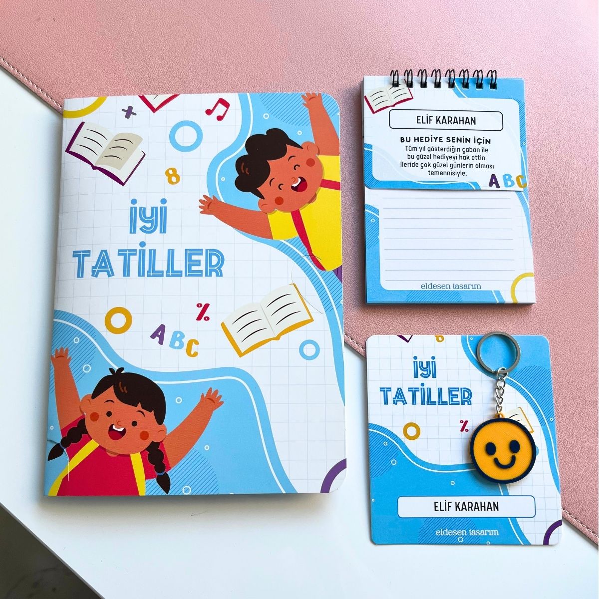 İsme özel defter, anahtarlık ve karne kılıflı içermektedir.
