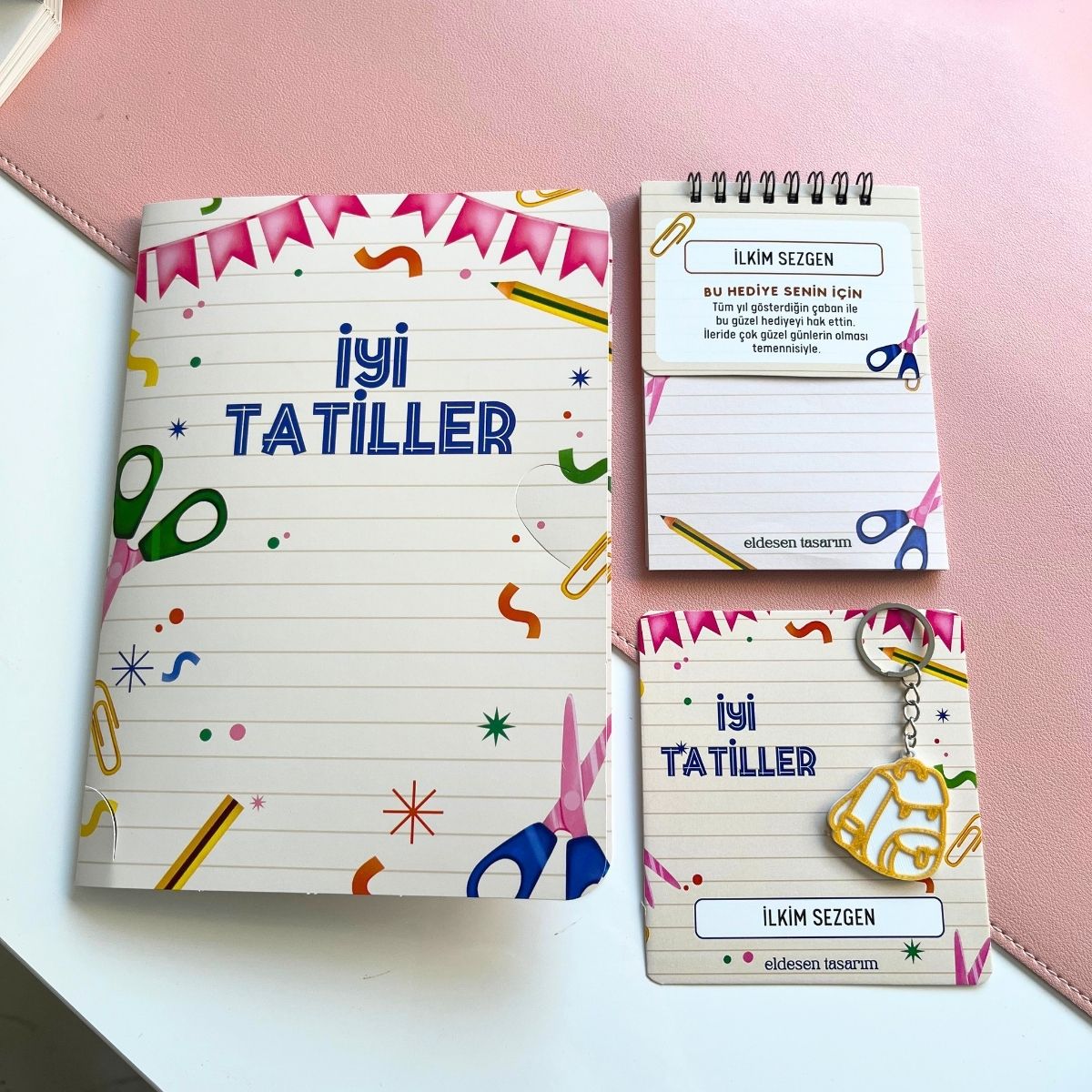 İsme özel defter, anahtarlık ve karne kılıflı içermektedir.