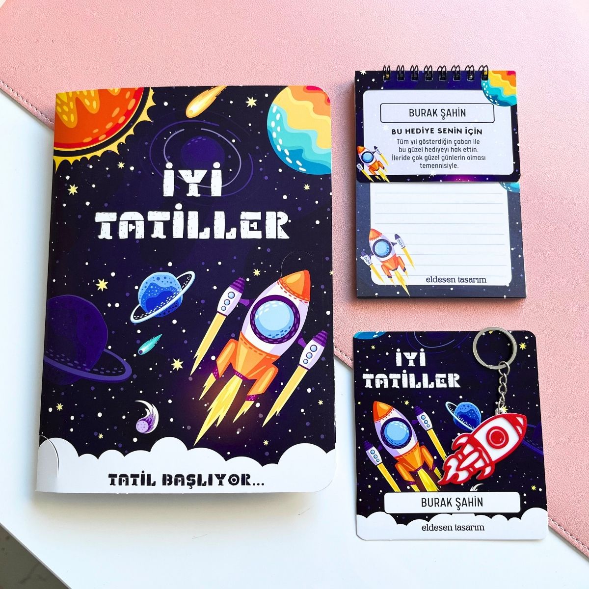 İsme özel defter, anahtarlık ve karne kılıflı içermektedir.